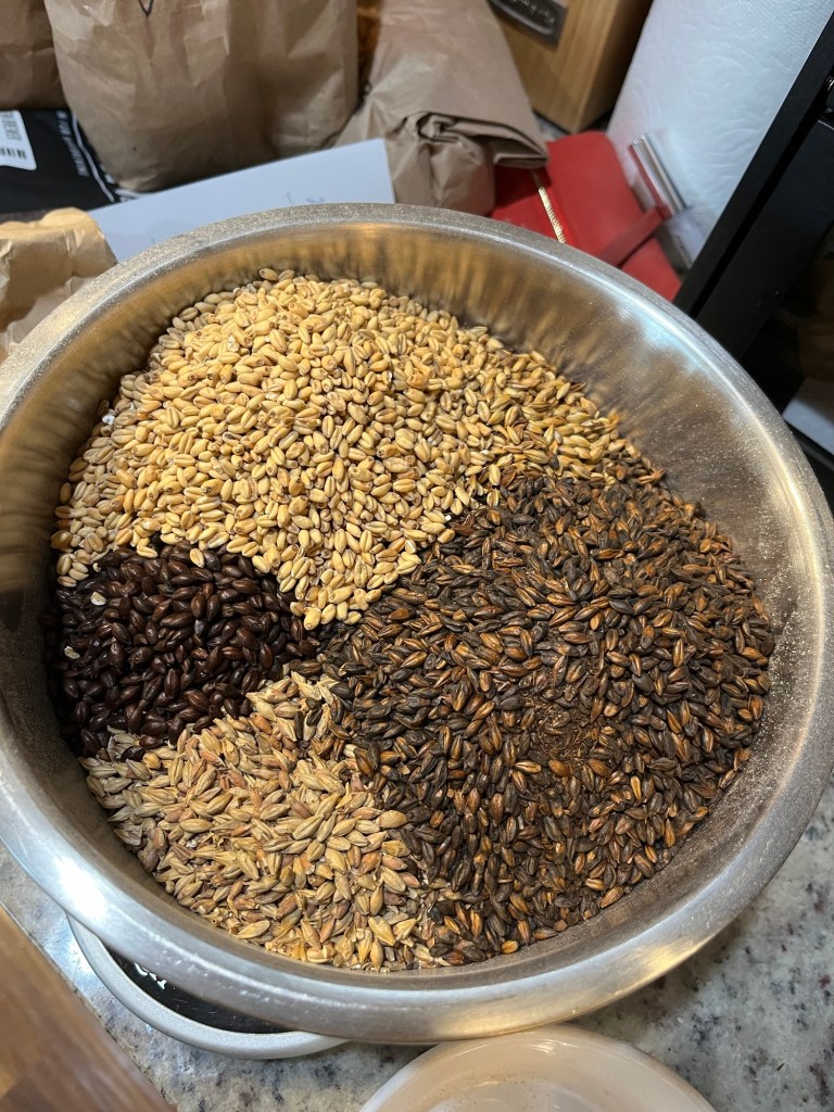 Today is another kitchen sink recipe. We’ve gathered a variety of specialty grains and hops over the years, and it’s time for some mid-winter clearing out. Given the range of grains we have, we decided to do something dark. So this one is a brown-ish ale using some NZ hops. It turned out to be pretty dark. We’ll see how this malt and hops combination goes.