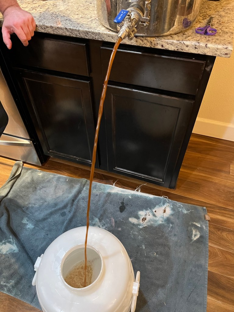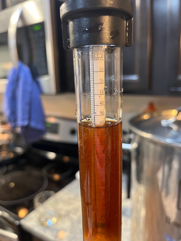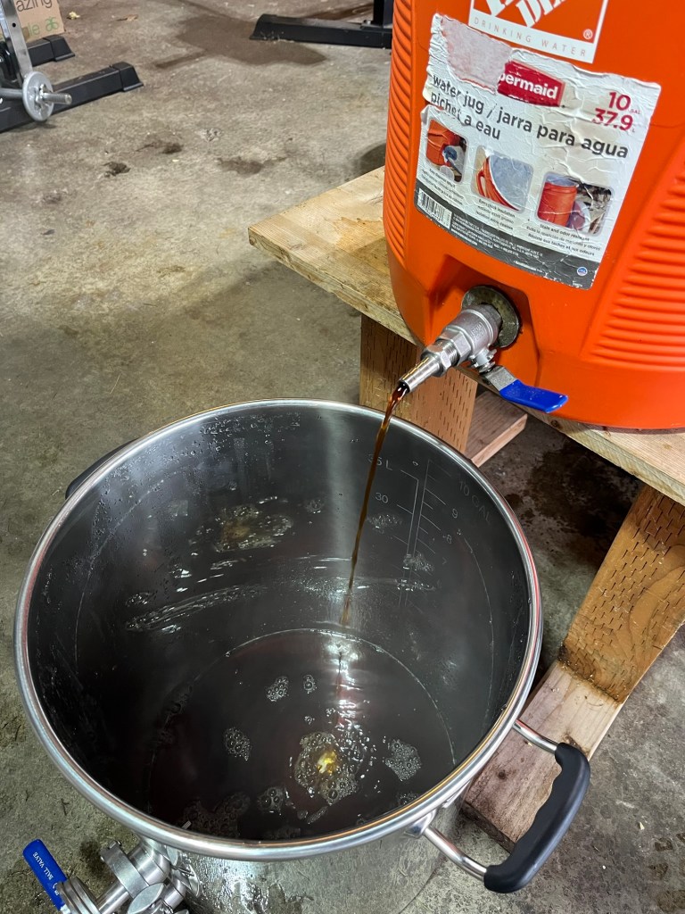 After 15 minutes, we added boiling water to get to 152°. Within the target volume, we weren’t able to 152°, though, so we had to do a decoction to get the temp up. Ended up doing three rounds of decoction to finally hit 153°. I’m using “decoction” to mean that we pulled out about a half gallon of mash with liquid and grains and bringing it to a boil in another vessel then pouring it back in. I know that’s not quite the same thing that’s normally meant be decoction mash, but it makes me feel like we’re doing cool brewing stuff.