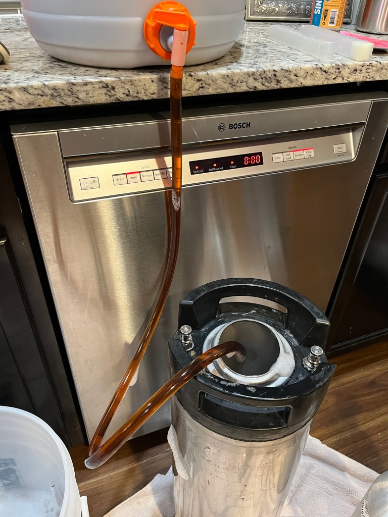 Mashing at 150°After an hour mash, temp was basically the sameUsed this much fresh gingerChopped up the gingerCrushed the allspice Added two pounds of pitted cherries to the fermenterThe spice addition, added to the boil for 5 minutes and left in during wort coolingAdding to fermenterCouldn’t find the beer thief, so only a refractometer reading . 1.077 for the OGStashed the beer in the corner of the kitchenOn bottling dayVery clear coming through the lineFinal gravity about 1.020