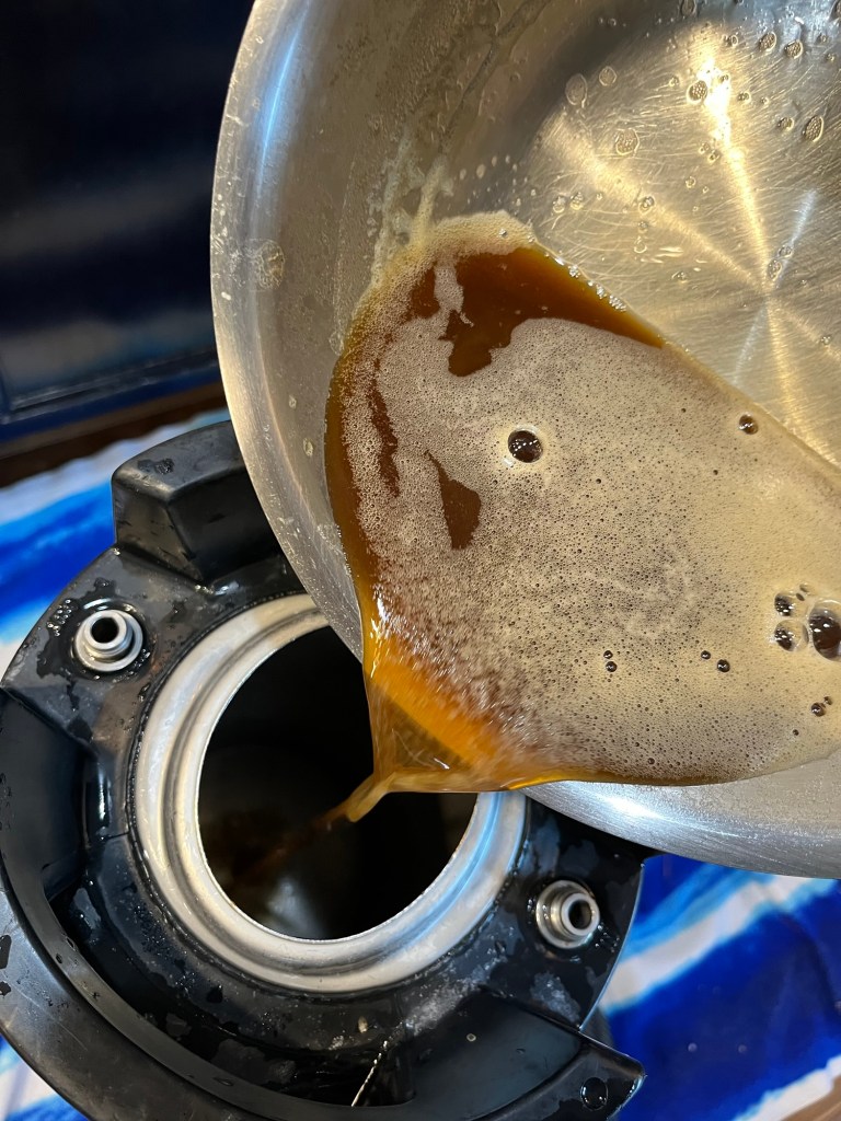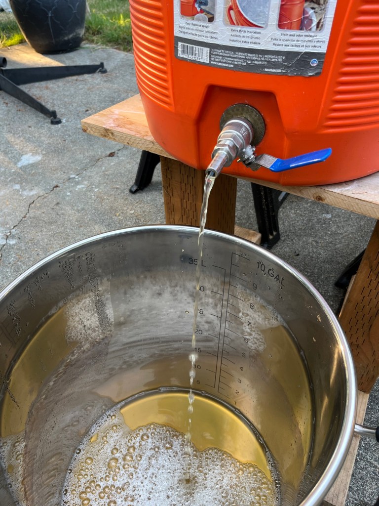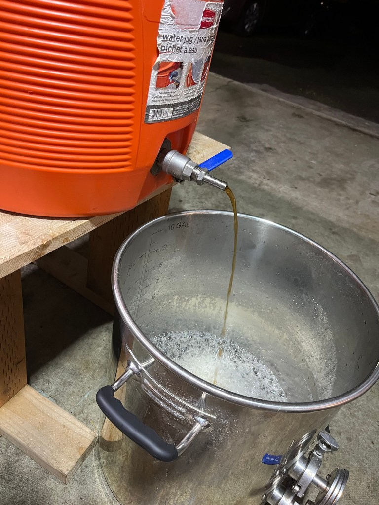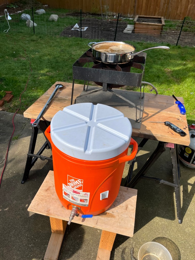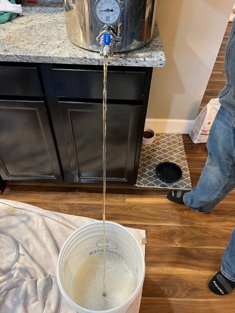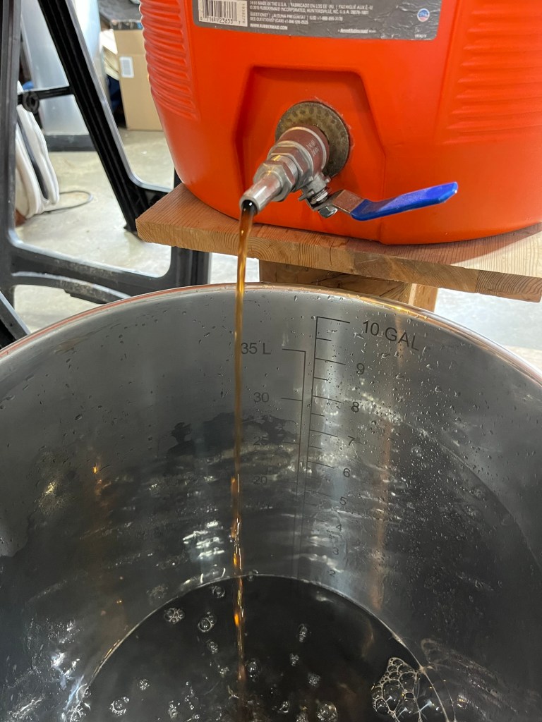 After 15 minutes, we added boiling water to get to 152°. Within the target volume, we weren’t able to 152°, though, so we had to do a decoction to get the temp up. Ended up doing three rounds of decoction to finally hit 153°. I’m using “decoction” to mean that we pulled out about a half gallon of mash with liquid and grains and bringing it to a boil in another vessel then pouring it back in. I know that’s not quite the same thing that’s normally meant be decoction mash, but it makes me feel like we’re doing cool brewing stuff.